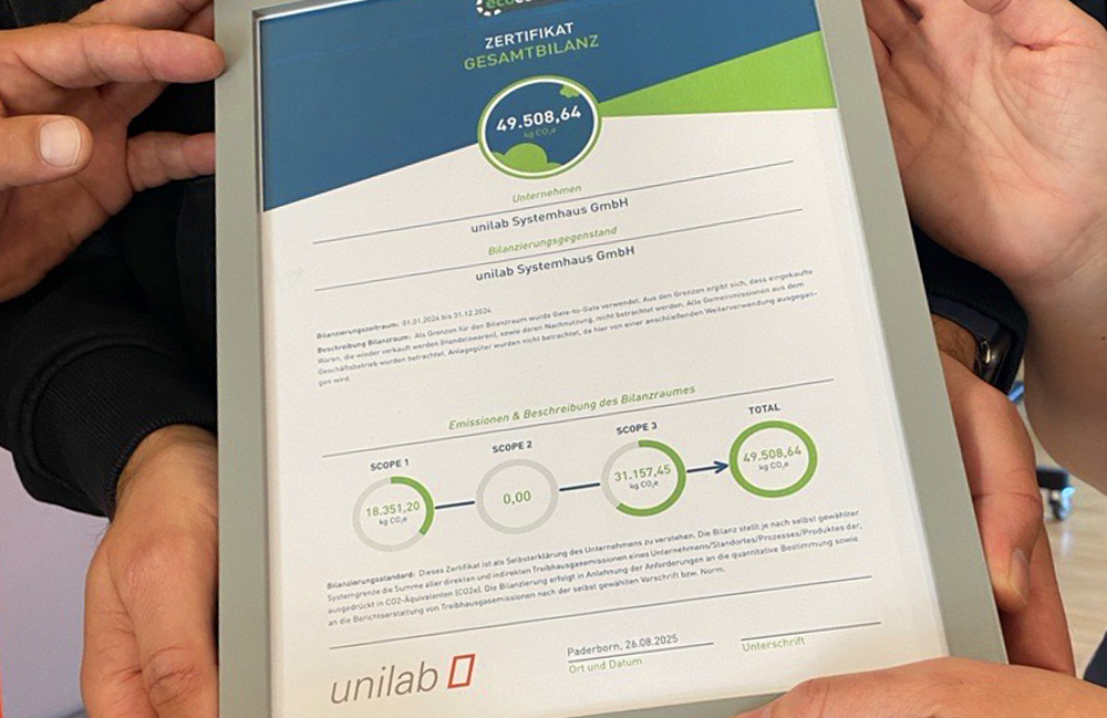 Um dem vorauszugreifen, sind wir 2022 bereits gestartet und haben mittlerweile das Zertifikat ecocockpit für unsere CO²-Gesamtbilanz 2024 erhalten. Damit haben wir die Basis für eine vergleichbare Grundlage geschaffen. Unsere Maßnahmen in 2024, wie z.B. die Weiterentwicklung des E-Fahrzeugpools oder der Bezug von Ökostrom, sind mess- und sichtbar geworden und wirken sich positiv auf unsere Bilanz aus. Mit diesem Schritt möchten wir das Bewusstsein bei Mitarbeitenden, Kunden und Lieferanten schärfen. Wir sind dankbar für das gewonnene Wissen und die wertvollen Erfahrungen, die wir auf dem Weg zu diesem wichtigen Zertifikat gemacht haben und freuen uns auf die Zukunftsprojekte, mit denen wir uns weiter verbessern wollen.